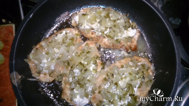 К делу, берем куринное филе, разрезаем вдоль, чтобы тоньше было, отбиваем, слегка присаливаем, можно специями посыпать и отложить. В это время соленые огурчики (не маринованные) мелко режем. Можно прям в огурчики выжать зубчик чеснока или лук зелёный порезать. Одно яйцо взбиваем слегка вилкой, обмакиваем в него наше отбитое филе и на сковородку. Когда обжарится с одной стороны, переворачиваем, смазываем майонезом, выкладываем наши огурчики