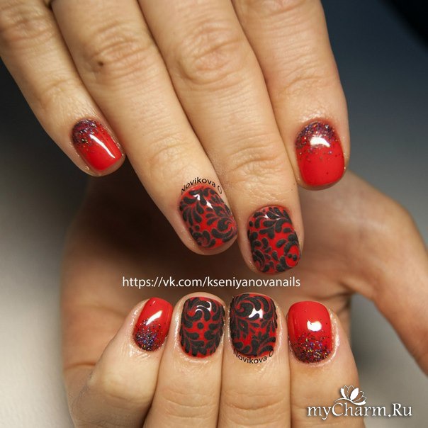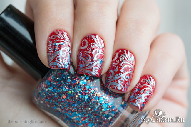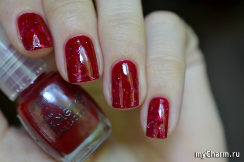 Это не лак с блестками. Это красное "стекло". Накрашено в 1-2 слоя, потом прозрачный лак с блестками, а на него сверху опять слой этого красного лака. И получается, что блестки просвечивают сквозь верхний цветной слой.