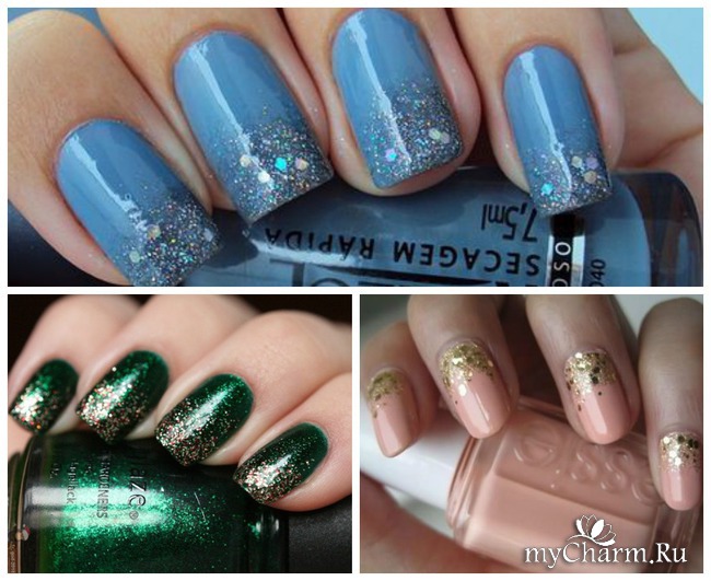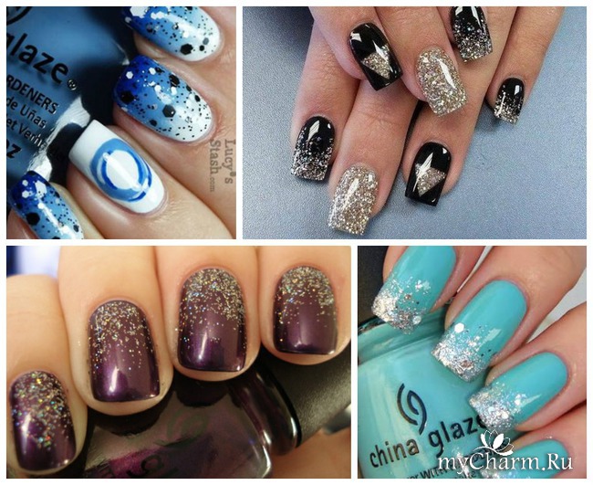 Или совсем простой вариант микса: лаки-кремы и глиттерные лаки. Но желательно не просто банально целиком накрасить ногти глиттерным лаком на цветную подложку, а уложить глиттер фигурно или в виде растяжки от края ногтя к кутикуле или в обратную сторону.