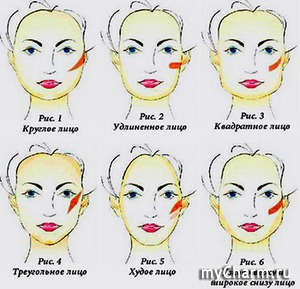 5. А если лицо имеет грушевидную форму, то есть расширяется книзу, то наносить румяна следует на нижнюю часть щек, растушевывая их по направлению к скулам.