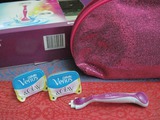 К этому прекрасному дню я получила роскошную бритву Venus от Gillette c двумя насадками и красивой яркой косметичке. А сложено это великолепие было в яркую красивую коробку.