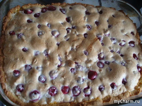 Выкладываем начинку, выливаем сверху белковую массу и ставим в духовку.