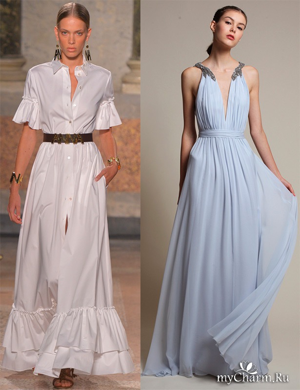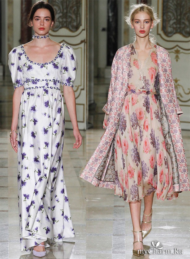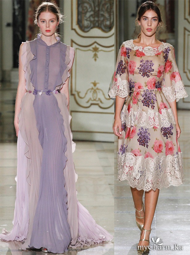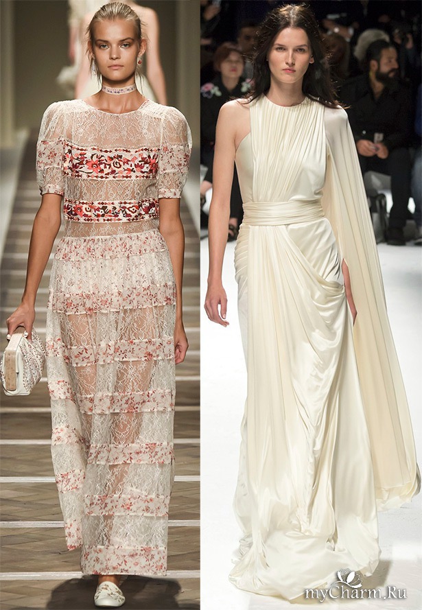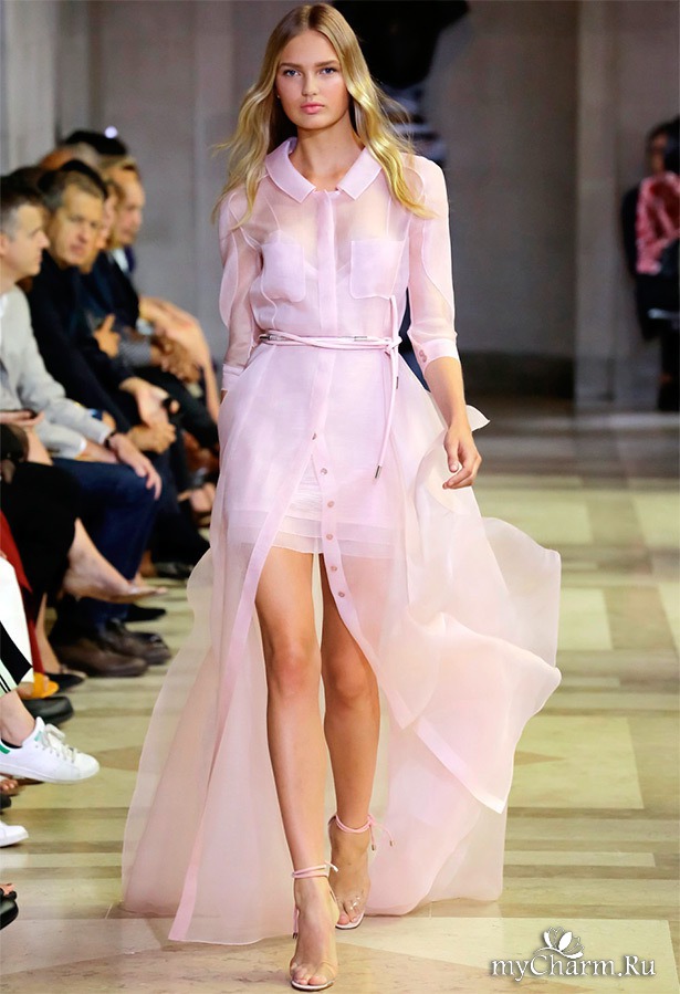 Интересные романтические решения предложены в коллекции Carolina Herrera на основе различных оттенков белого. Прозрачные шёлковые ткани создают фантастическую палитру – от ослепительно белого до розоватой дымки, напоминающей утреннюю зарю.