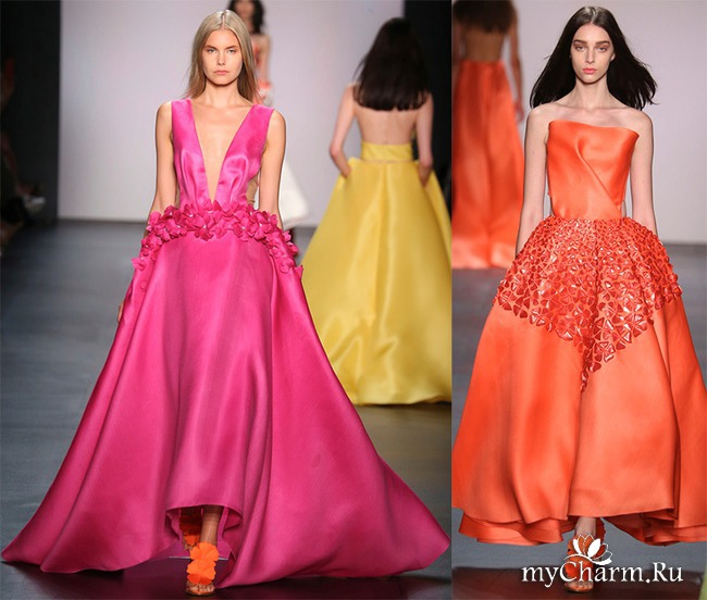 В коллекции PPQ преобладают чёрные, белые и электрический синий цвет. Все оттенки белого переходят в фиолетовый туман в коллекции Tadashi Shoji.