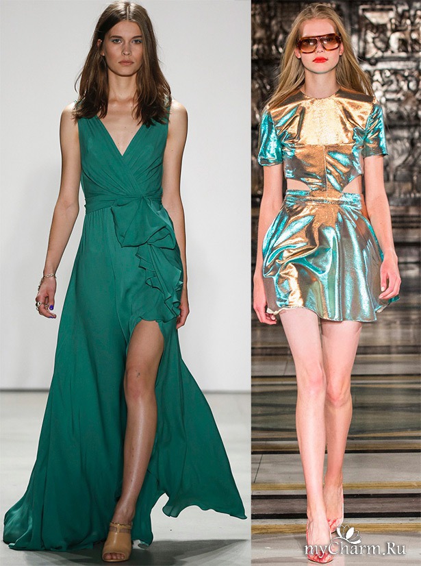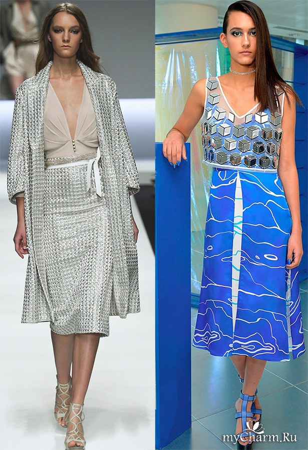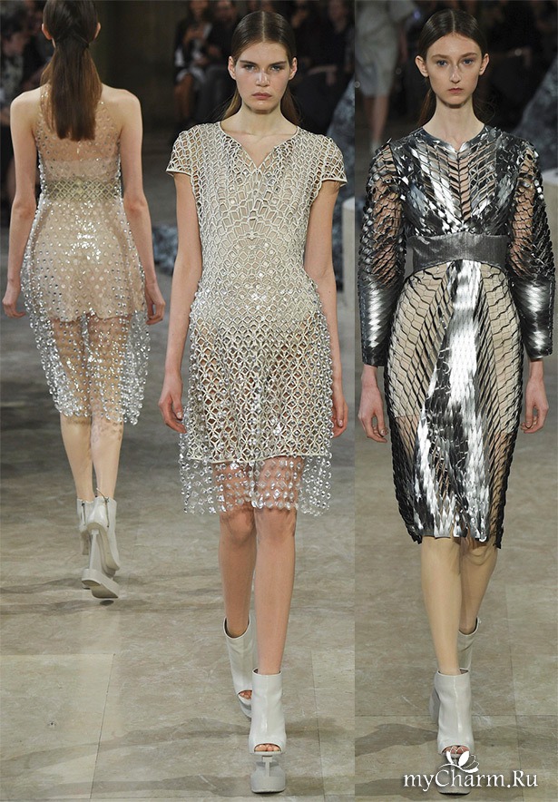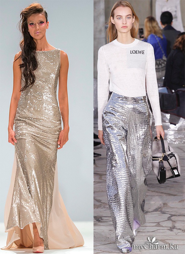 Серебро – от тусклого до расплавленного, встречается во многих коллекциях, и серьёзно заявляет о себе. Серебряный блеск ещё более усиливается в платьях, сплетённых из сетки, или со стразами и светоотражающими пластинами.