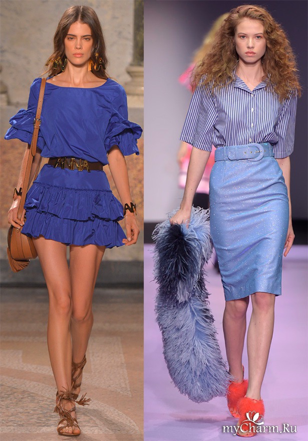 Жизнерадостно смотрится палитра в голубых цветовых оттенках в твидовых тканях Chanel, синие и фиолетовые полевые цветы романтично сочетаются с сиренью у Luisa Beccaria.