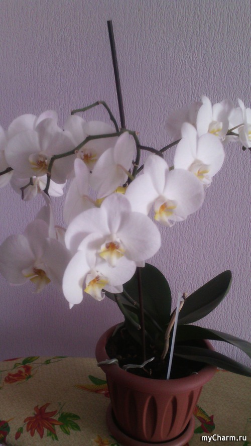 Эту орхидею мне подарил муж на очередной день свадьбы несколько лет назад. С тех пор она цветет по несколько раз в год, особого ухода не требует, ибо это сорт Фаленопсис (один из неприхотливых сортов орхидей, как раз для таких новичков, как я!!!). Требует только полива, света и подкормки - во время цветения подкармливаю раз в две недели специальным удобрением для орхидей, поливаю раз в неделю. Говорят, что для орхидей лучшая сторона - северо-запад, но у нас только южные окна, поэтому повесили затеняющую пленку, что цветок не сгорел. Не любит сквозняки и морозы. Здесь она у меня выбила одну стрелку с почками уже после пересадки в больший горшок, причем достаточно быстро. Старалась "выгнать" цветы ближе к февралю-марту, под Дни Рождения и мартовские праздники, вроде бы получилось! Так как орхидея может цвести до нескольких месяцев, и цветы к празднику покупать не нужно!!!