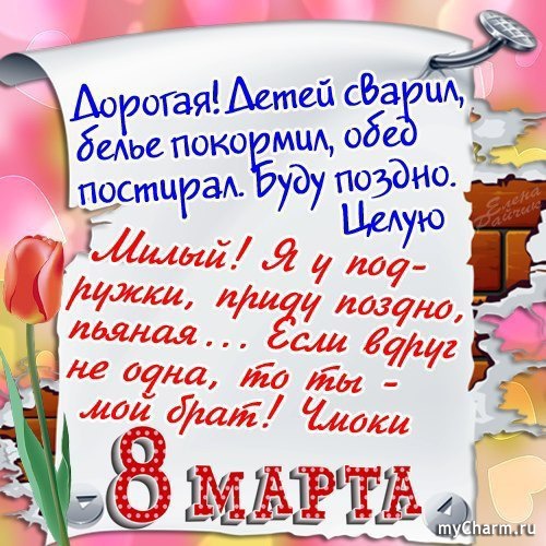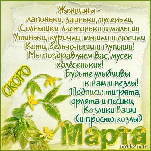 Дорогие мои Майшармельки!!! Сегодня на работе поздравляемся: тюльпаны мужчины вручили, открыточки всем-всем нашим девушкам я отправила, мужчины к обеду чего-то там соображают САМИ, поэтому есть чуток времени на себя и наш сайт Пока подыскивала чего-то красивое для поздравления, нашла вот такую открыточку ... Читать полностью |