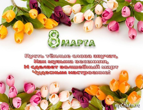 В этот чудесный весенний день хочу поздравить всех вас, девочки, подружки, с прекрасным праздником 8 марта!! Пусть тюльпаны яркие алеют И ручьи веселые звенят, Солнце теплой ласки не жалеет, Все мечты исполниться спешат! В этот день волнующий, прекрасный Только начинается весна! Пусть мгновенья радости и счастья Всем в подарок принесет она... Читать полностью |