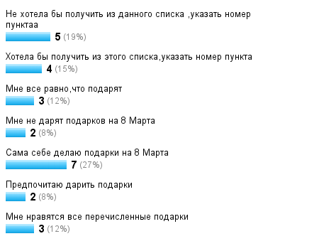 В опросе выбрала вариант№1: не хотела бы подарок из п.8, терпеть не могу навязывания чего-либо, и увлечений в т.ч. А вот ваучеры и др. из п.9 не будут навязыванием, если дарящий учтет мои предпочтения (я, например, обожаю боулинг). Не понимаю, как чашки из п.4 можно поставить в один "пылесборочный" ряд с плюшевыми игрушками. А уж от п.1 вообще выпала в осадок: "дешевая бижутерия", сравнимая по стоимости с официальной МРОТ - это, извините меня...