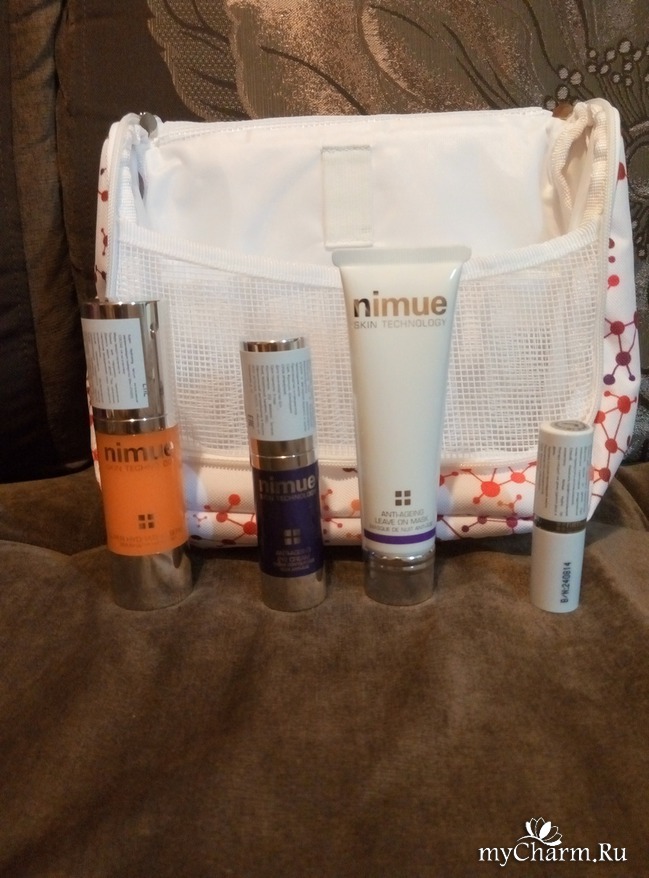 Там оказался набор косметики Nimue (Интенсивная увлажняющая сыворотка, интенсивный омолаживающий крем для кожи вокруг глаз, антивозрастная ночная маска, увлажняющее средство-терапия для губ перламутр и очень удобная и красивая косметичка.)