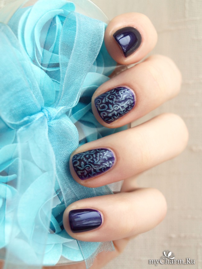 • Очередной темно-фиолетовый маникюр, разбавленный бирюзово-фиолетовым стемпингом.