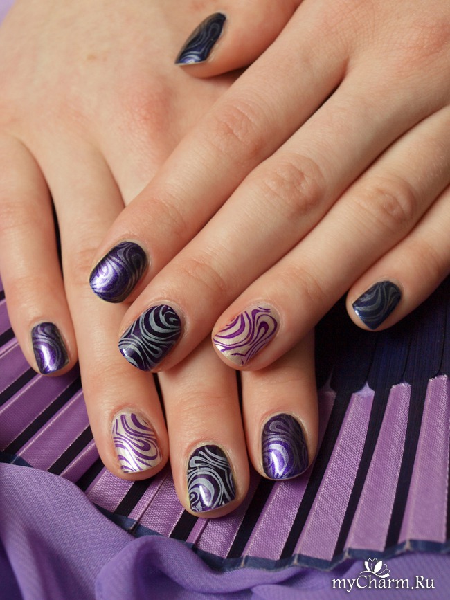 Решила поэкспериментировать, сочетая несколько фиолетовый оттенков, сочетая с глянцевым и перламутровым белыми оттенками лака. Сам процесс создания мне понравился даже больше, чем результат=)