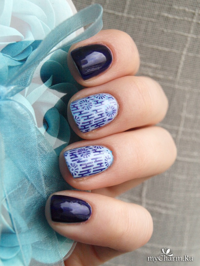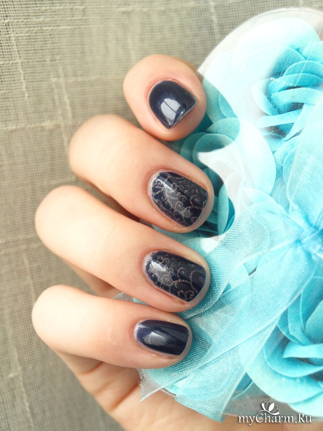 • Дополнила любимую синюю гамму темно-синим маникюром с золотистым стемпингом=)
