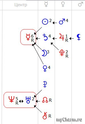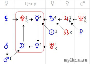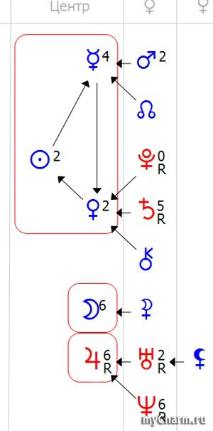 У вас тоже один центр, но уже с 6 планетами, это значит, что у вас очень много способностей, но в тоже время, велека вероятность распылиться, к тому же в любом случае все планеты надо стараться развить. Перед вами просто огромное поле деятельности. И активистка (Юпитер), хозяйка (Луна), притягательная личность (Солнце) с глубоким внутренним миром и богатым воображением (Нептун) с подвешенным языком (Меркурий). Обязательно занимайтесь спортом, можно плаванием, тогда и Нептун будет завязан. Не удивлюсь если ваш мужчина программист, вас прельщают мужчины-Ураны. А еще мне кажется вы очень интересная личность с таким набором-то, хотела бы с вами дружить