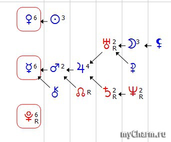 А еще глядя на формулу можно таким образом изобразить твою жизнь. Повоевала с кем-то в социуме, отвоевала свое место под Солнцем (Марс), потом на кухню, к семье (Луна), потом всех своих любимых обогрела (Солнце), немного ушла в себя (Нептун), что-то продумала и опять с набором мыслей к народу, кого научать( Юпитер), кому советы давать, просто поболтать (Меркурий) и опять с напором в активную деятельность.