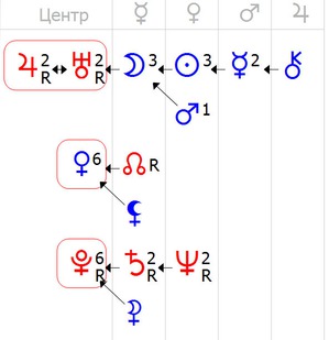 У тебя и Солнце и Луна и Меркурий, и они не в одной цепочки, т.е. не должны вытекать одна из другой, а между этими тремя центрами можно переключаться, прочитаете про них выше.