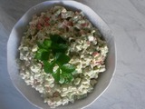 1 упаковка крабовых палочек. Палочки порезать соломкой. Все поперчить, добавить травяные приправки и заправить майонезом, буквально 1 или 2 столовые ложки, любителей йогурта, заправить последним. Салат получается очень нежный и вкусный, мало кто догадывается, что в его составе творог.. Приятного аппетита!