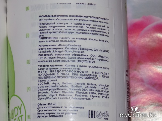 Что можно сказать о нем? Крем-лосьон непрозрачный белый. С легким ароматом зеленого яблока, чуть менее интенсивным, чем у шампуня. Очень нежный, воздушный, как взбитое масло. Распределяется очень легко по коже. Имеет удобный конусик-дозатор. Если не умудритесь сломать или повредить его при первом открывании – будет служить вам верой и правдой, пока средство не закончится.