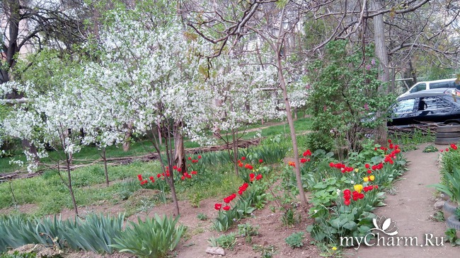 А вот абрикосы и вишни - цветение в самом разгаре. Тюльпанчики пошли, нарциссы, крокусы и мелкие петушки. Красотааа!