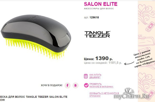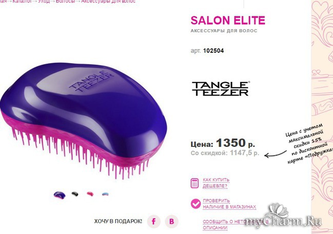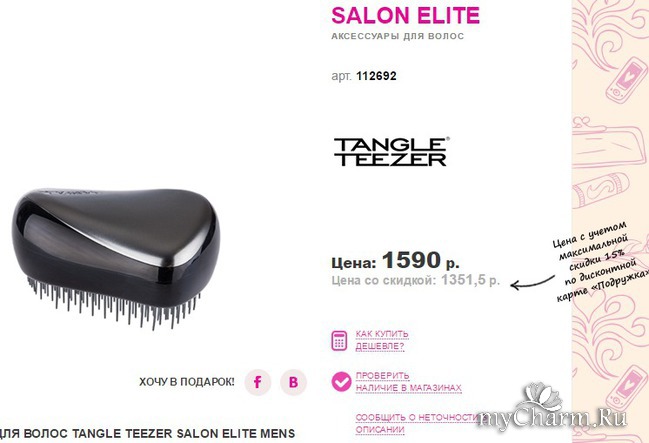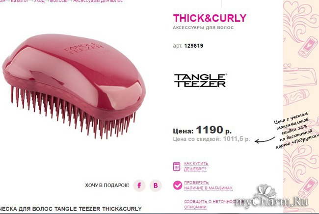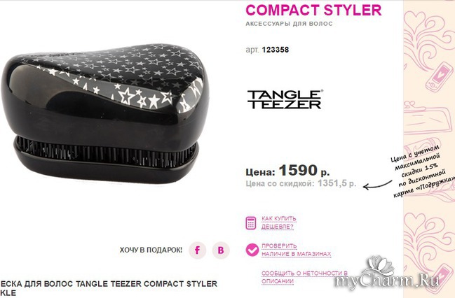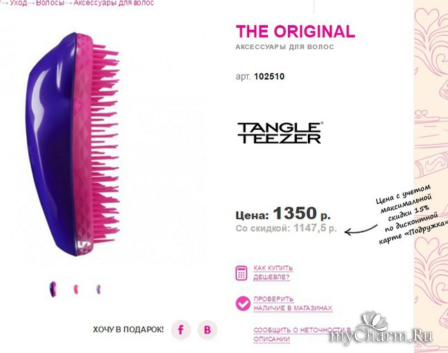 Я этот скидочный день планирую заранее и сразу выбираю, что же я такое там хочу, что не так срочно горит, а потому можно подождать и сэкономить. И вот - я наконец-то решилась на покупку Тангл Тизера!! Меня радовало еще и то, что ценник на эти расчески в "Подружке" был 1190, когда даже на офф. сайте он уже вырос. Однако! На днях я зашла на сайт проверить, как там дела и обнаружила, что и там цену задрали