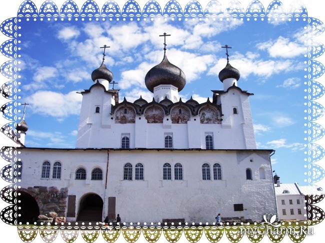 Преображенский собор (1558/66) с пирамидальными скошенными стенами, от которых должны были рикошетировать вражеские ядра. Соловецкий монастырь являлся пограничной крепостью с гарнизоном и артиллерией, выдержал несколько нападений шведов (1571, 1582 и 1611 гг.). В 1854 году Соловецкий кремль был обстрелян английскими фрегатами.