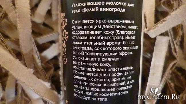 Увлажняющее молочко «Белый виноград» увлажняет, питает, успокаивает кожу после солнечных ожогов, эритем, аллергических высыпаний, смягчает, восстанавливает эластичность, оздоравливает, тонизируя ее.