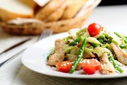 Куриную грудку обмывают, удаляют шкуру, нарезают полосками и обжаривают на сковороде на растительном масле до полной готовности. Стручковую фасоль отваривают в подсоленной воде, сцеживают и дают обсохнуть. Перец очищают от семян, нарезают полосками. Лук очищают, шинкуют и обжаривают, добавляют к нему фасоль и тушат 5-7 минут, затем добавляют мясо, перемешивают и тушат еще пару минут. Получившийся горячий салат выкладывают в глубокое блюдо и заправляют. Заправка: бальзамический уксус вливают в горячую воду, солят, перчат и перемешивают.