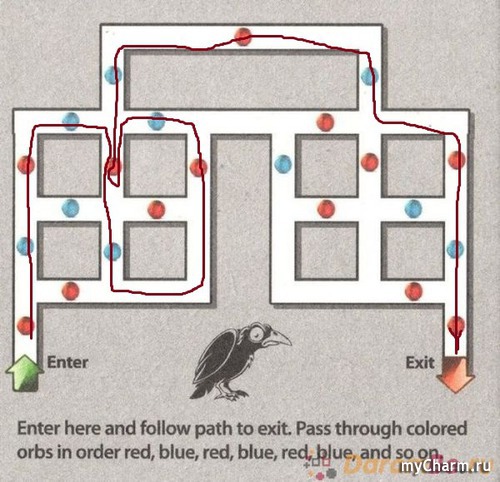 Задача на первый взгляд совсем простая — пройти «лабиринт» от входа до выхода, чередуя на своем пути красные и синие точки. Использовать все точки вовсе не обязательно. Учтите: загадка может не даться с первой попытки даже трезвому человеку.