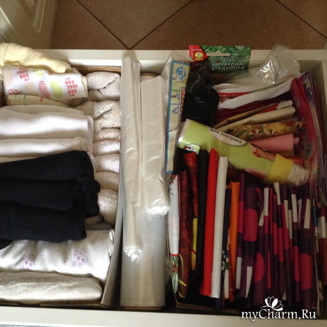 Пытаюсь применить различные приспособления для того, чтобы порядок было соблюдать проще. Например для пакетов на кухне, использую держатели, напоминающий кофр для белья. Несколько квадратный ячеек соединенных вместе. Для этого использовала 12 коробок от молока, обрезанные на высоту кухонного ящика и соединенные вместе с помощью скотча. А для круп купила не дорогие одноразовые контейнеры в магазине упаковки. Получилось очень бюджетненько и удобно.