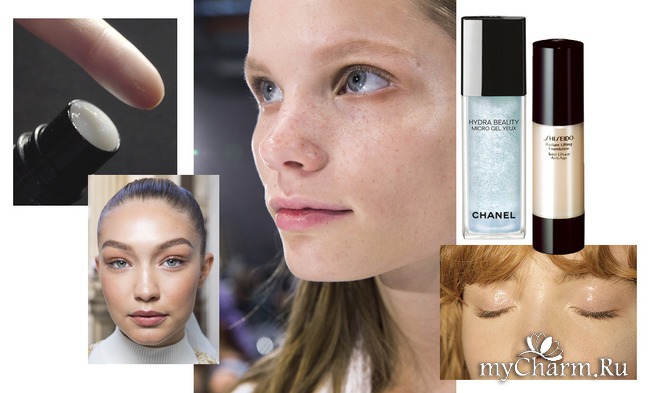 Лучше всего технически воплотил эту идею в жизнь Эндрю Гилмор, визажист шоу David Koma и амбассадор NARS UK. Суть его макияжа заключается не в использовании хайлайтера, а в нанесении глубоко увлажняющих и ухаживающих средств со светоотражающими частицами.