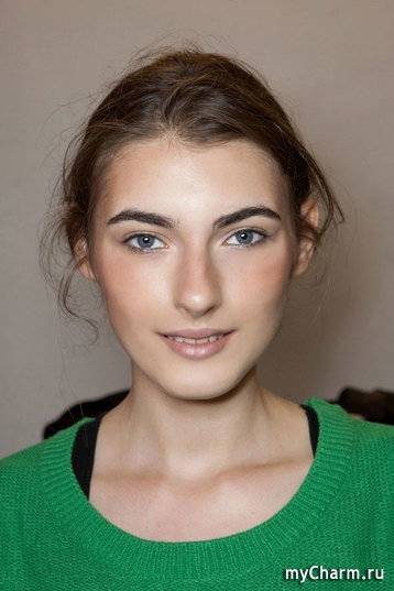 Завершающий штрих такого макияжа – в использовании двухцветных румян (лучше всего подойдет жемчужно-розовый тон в сочетании с бронзовым). Гилмор расставил эти акценты на лбу, спинке носа, яблочках щек ближе к переносице и на подбородке, а мерцающим блеском бронзового песка скорректировал овал лица – в зоне под скулой и заходя на виски по краю над бровями.