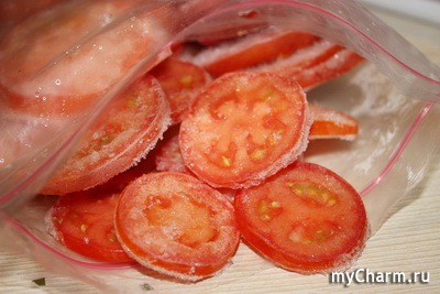 Небольшие мясистые помидорки (сливки, дамские пальчики) морозят целиком. Но прежде прокалывают в нескольких местах ножом, чтобы не лопнули. Томаты покрупней освобождают от кожицы, предварительно опустив в горячую воду, и нарезают на кружки, толщиной 4-5 мм. Замораживают, выложив в один слой на поддон или противень, застеленный целлофаном. Потом, естественно, пересыпают в мешки.