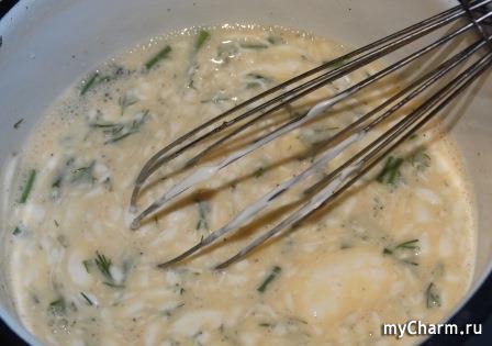 Взбиваем 5 яиц, 100 гр. майонеза, щепотку соли, черный перец, и зелень (я добавила укроп и петрушку)