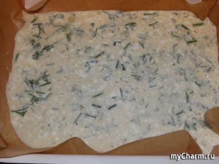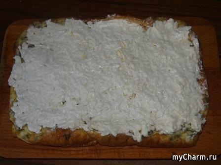 А как основа остыла, переложила её на досточку и намазала от души начинкой из сыра, чеснока и майонеза.