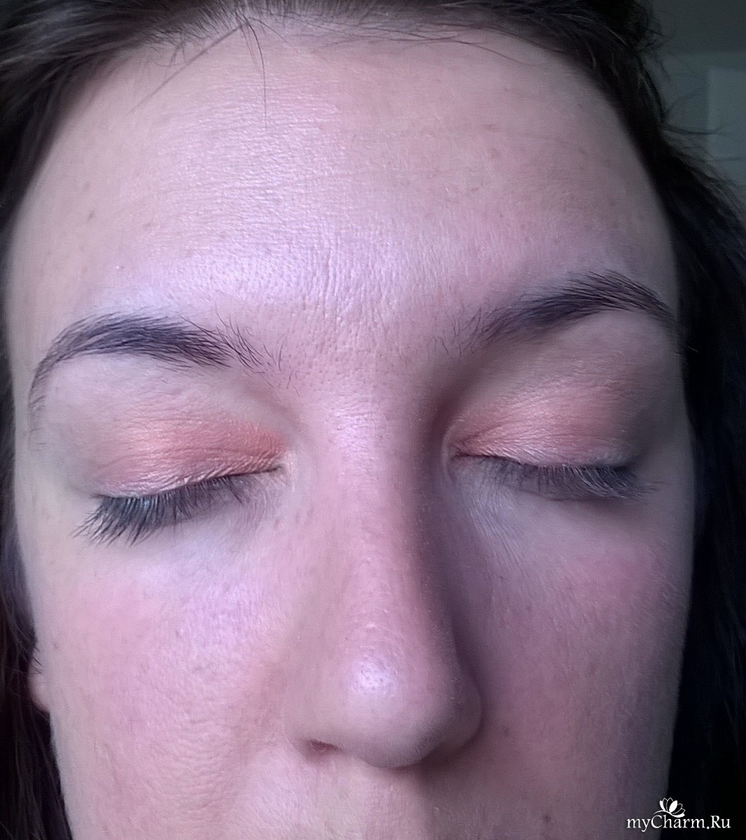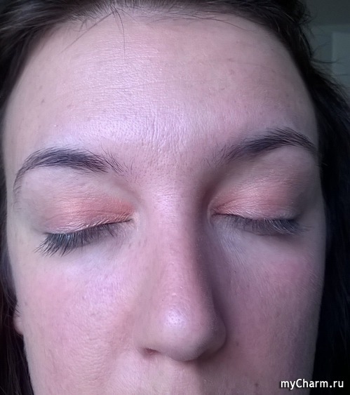 Первые тени имеют нежно оранжево-розовый цвет. Их я наношу на подвижное веко, от внутреннего угла глаза, до середины.