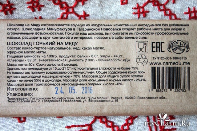 «Шоколад на меду» - это натуральный продукт, сделанный на мануфактуре, которая относится к благотворительному центру "Дом мастеров". Т. е. в создании этого вкусного продукта принимают участие люди, с ограниченными возможностями. Представляете, как это важно? Часть работников имеет ограничения по здоровью, а этикетки на шоколад печатают студенты колледжа. Вот такое благое и важное дело. В результате мы может купить исключительно полезный и качественный продукт и тем самым дать возможность развиваться такому производству.