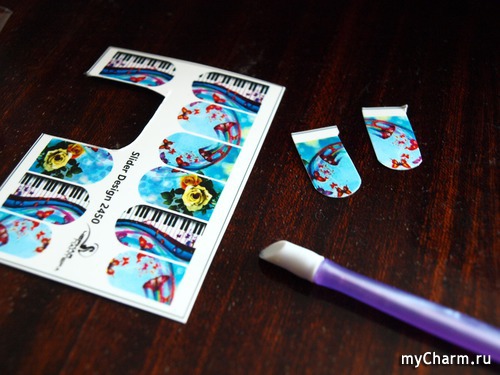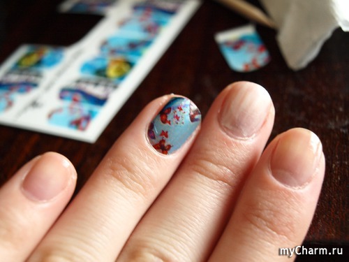 Но при этом у меня возникли небольшие проблемы с удалением излишков. Пленочка очень тоненькая, не отламывается, а начинает тянуться. Пришлось немножко повозится. Кстати, убираю излишки деревянной палочкой, смоченной в жидкости для снятия лака