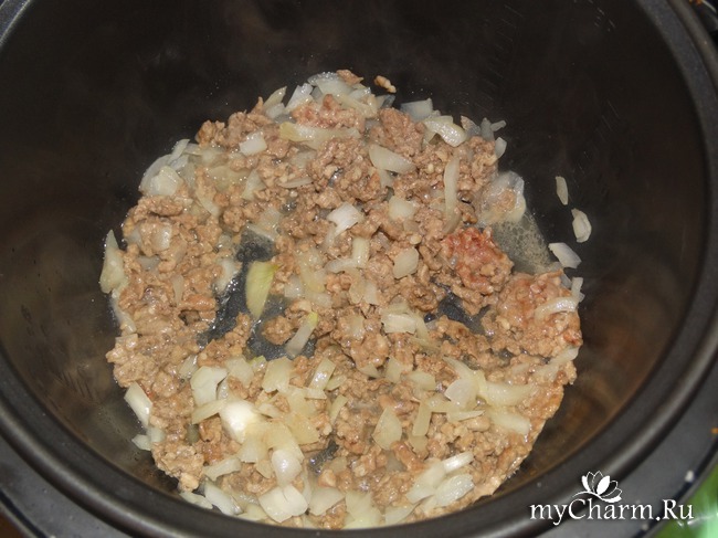 Вооружившись мультиваркой я обжарила в ней фарш с лучком.