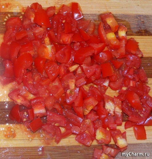 Затем нарезала помидорки (у меня были черри), кожицу с них не снимала.