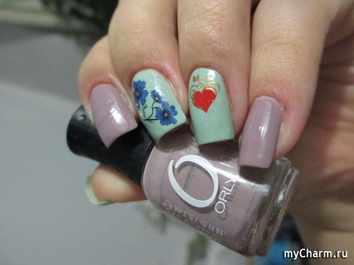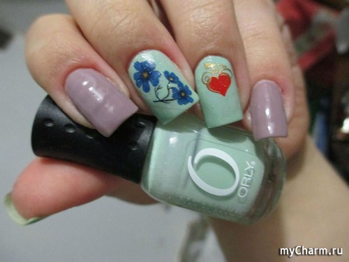 Хочу показать дизайн "Летние краски" с лаками Orly мятным Jealous, much? и сиренево-коричнево-серым You're blushing, акцентом слайдеры Milv.