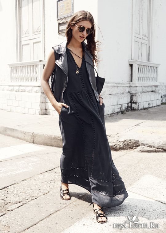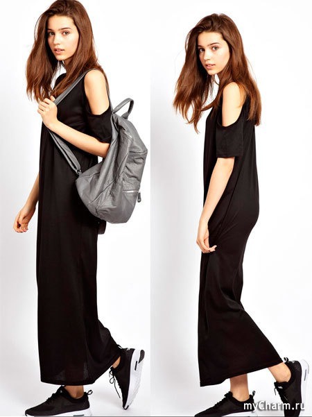 Свободный стиль. Черное платье в пол может быть отличным вариантом не только для изысканных вечеров, но и для дневных прогулок. Для этих случаев подбирайте платья свободного покроя, в которых удобно передвигаться по улицам города. Смело дополняйте кроссовками и рюкзаком. Другой вариант — бежевые босоножки на танкетке или сандалии без каблука. А для завершения накиньте свободный бежевый кардиган или джинсовку и возьмите большую сумку на плечо.