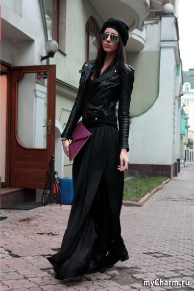 Кожаная куртка. Если Вы в душе рок-дива, то выпустите ее наружу. Это поможет создать отличный лук, состоящий из черного платья в пол из легкой, летящей ткани (можно с дополнением из прозрачных тканей, другой декор излишен), кожаной косухи и грубых ботинок. Дополнить образ помогут солнцезащитные очки-авиаторы и яркий клатч.