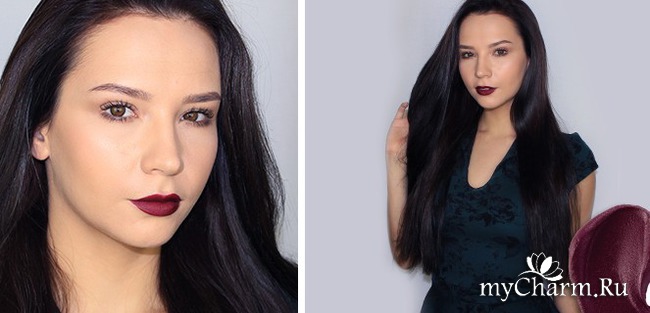 "Помада вкусного, модного и супер-универсального оттенка, который идеально сочетается с любым тоном кожи – от самой светлой до смуглой! Муссовая текстура и матовый бархатистый финиш очень красиво выглядит в цвете бургунди. Именно поэтому мне захотелось оставить образ готическим с максимально натуральными глазами и бровями. На ум сразу приходит ассоциация с бархатистыми розовыми лепестками".