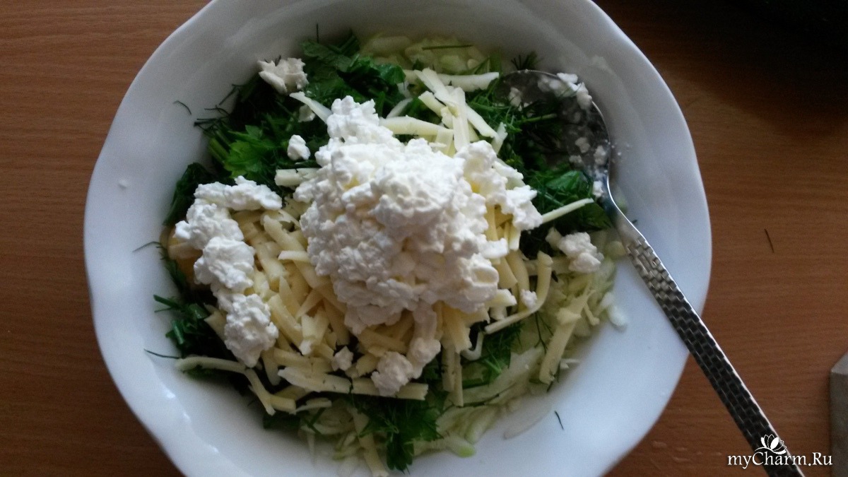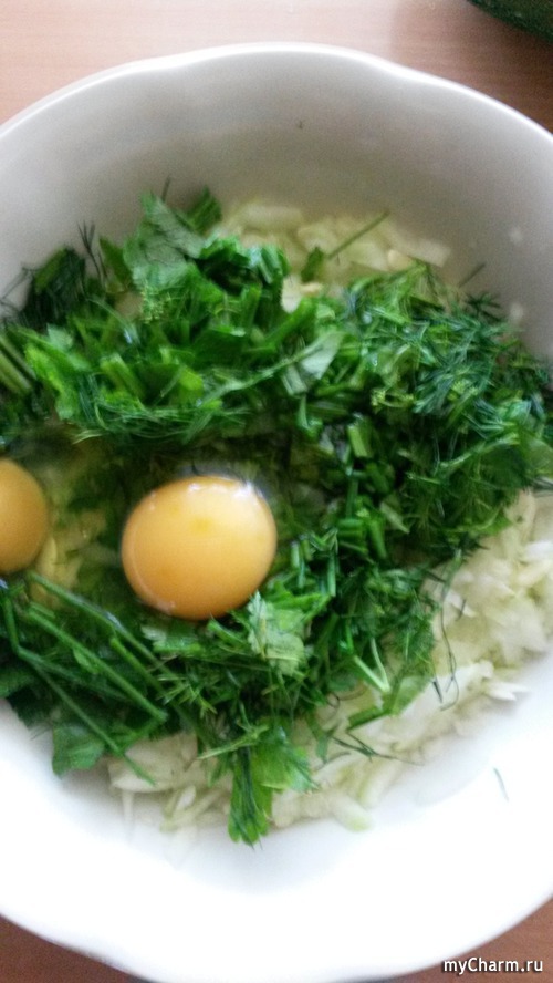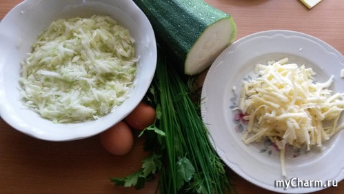 Для этого нам понадобится четверть кабачка,2 яйца,100 гр сыра, 100 гр зернистого творога, 2 столовые ложки муки, 1 пучок зеленого лука, петрушки, укропа.