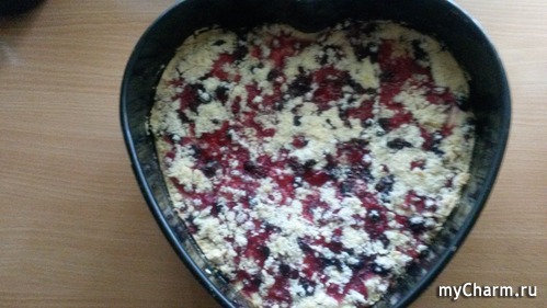 3. Ягоды укладываем на йогуртовую подушку, посыпаем остатком мучной смеси и ставим в духовку, предварительно нагрев ее, температура 180-190 градусов, на 30-40 минут.