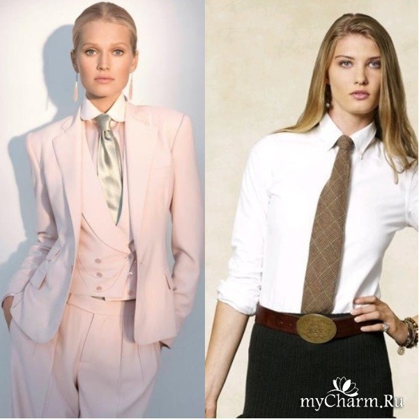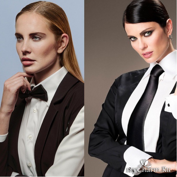 Среди предлагаемых фасонов присутствуют самые разнообразные цвета, узоры и узлы, с помощью которых можно превратить этот аксессуар в настоящее украшение в повседневном деловом, а также романтическом стиле. Иногда в качестве этого аксессуара модельеры используют шелковый шейный платок, легкий шарфик, завязанный в виде галстука. Популярными становятся бабочки всех оттенков и конфигураций. Естественно, что не должно быть никаких блесток, нежных узоров, рюшей и кружева. Четкость линий, строгость стиля и классические материалы: кашемир, шелк, тонкий драп.