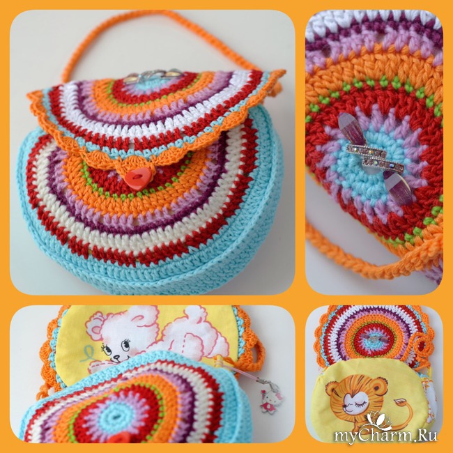 Связалась также известная в вязальных кругах яркая сумочка от Вендуллы Мадерски. Яркие цвета радуют глаз, дочка постоянно открывает и закрывает сумочку на пуговицу, трогает пришитую брошку, ей нравятся игрушки с разными цветовыми сочетаниями.
