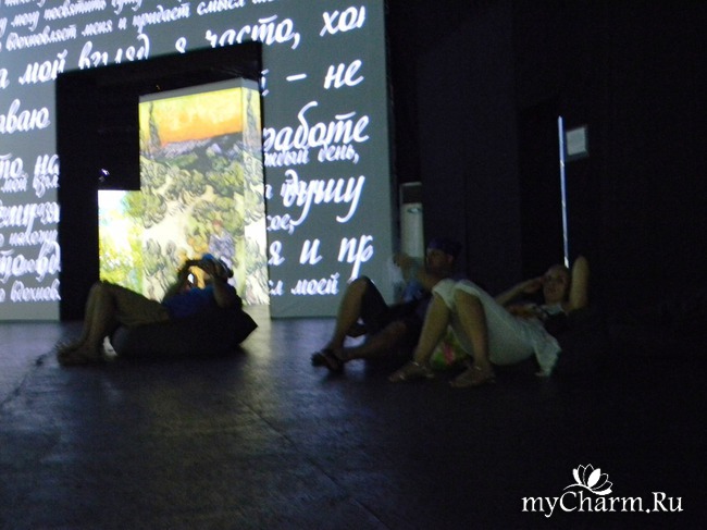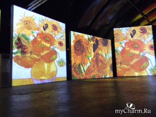 На территории Олимпийского парка проходила интерактивная выставка Ван Гога. Там на больших экранах показывали его работы, причем это было сделано в движении: куда-то уходил человек, расцветали ирисы, вращалось звездное небо.