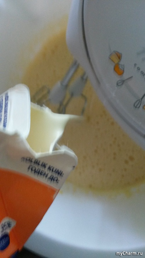 Яйца взбить с сахаром миксером, добавить сливки, муку, все перемешать, на кончике ножа ваниль.